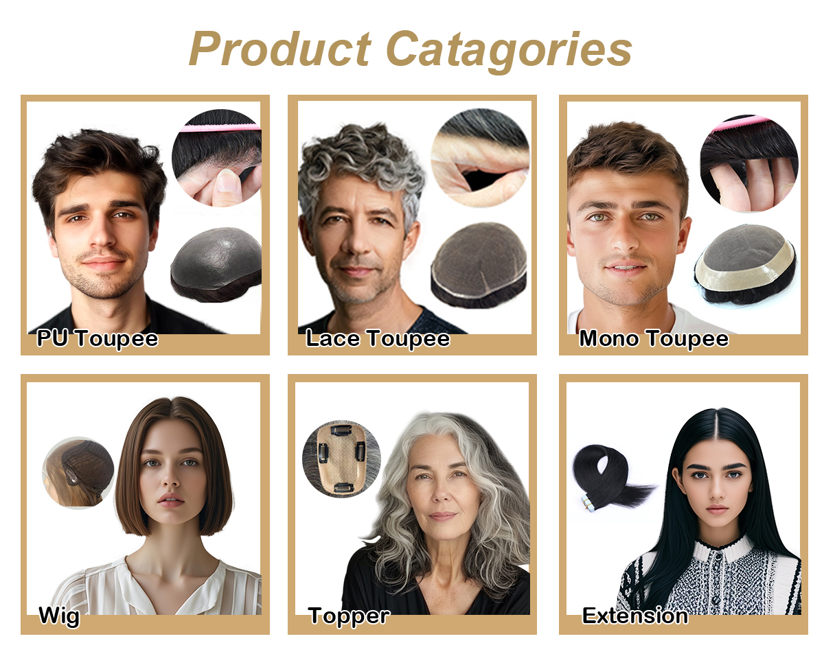 Productos principales:Tupé, Extensión de Cabello, Topper, Peluca de Encaje, Extensión de Pestañas